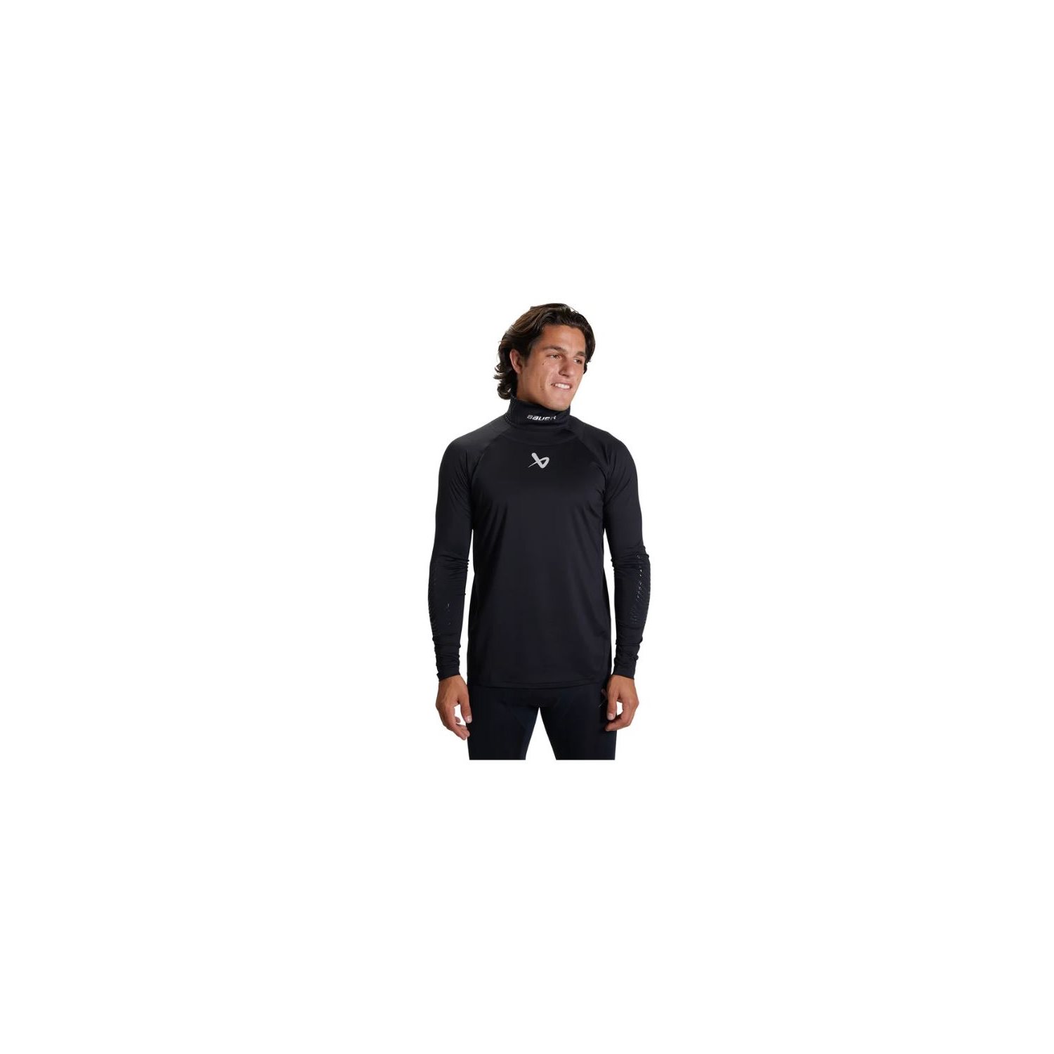 Bauer underställströja med integrerat halsskydd i DuPont Kevlar® cut-resistant material. Flat-lock sömmar för att motverka skav. Nytt material med HeiQ Fresh teknologi förhindrar dålig lukt som orsakas av bakterier. HeiQ Smart Temp teknologin hjälper även till att reglera kroppstemperaturen. På armbågarna sitter printade greppzoner som håller dina armbågsskydd på plats.